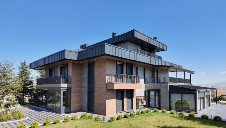 Dış cephe, yapının koruyucu kalkanıdır. İncek gibi rüzgarın yoğun olduğu bölgelerde, mekanik montajlı taş kaplamalar veya kompozit paneller, binanın nefes almasına olanak tanır. Cephede kullanılan malzemelerin dokusu, iç mekana dair ipuçları taşır. Örneğin, doğal taş kullanımı, yapının yere sağlam bastığı hissini uyandırır. Ahşap detaylar ise soğuk cephe malzemelerini yumuşatır ve sıcak bir karşılama etkisi yaratır. Çatı eğimleri ve yağmur suyu tahliye sistemleri, kar yükü hesaplamalarına göre şekillenir. Gizli dereler ve yağmur iniş borularının cephe estetiğini bozmayacak şekilde gizlenmesi, modern mimarinin getirdiği çözümlerden biridir.